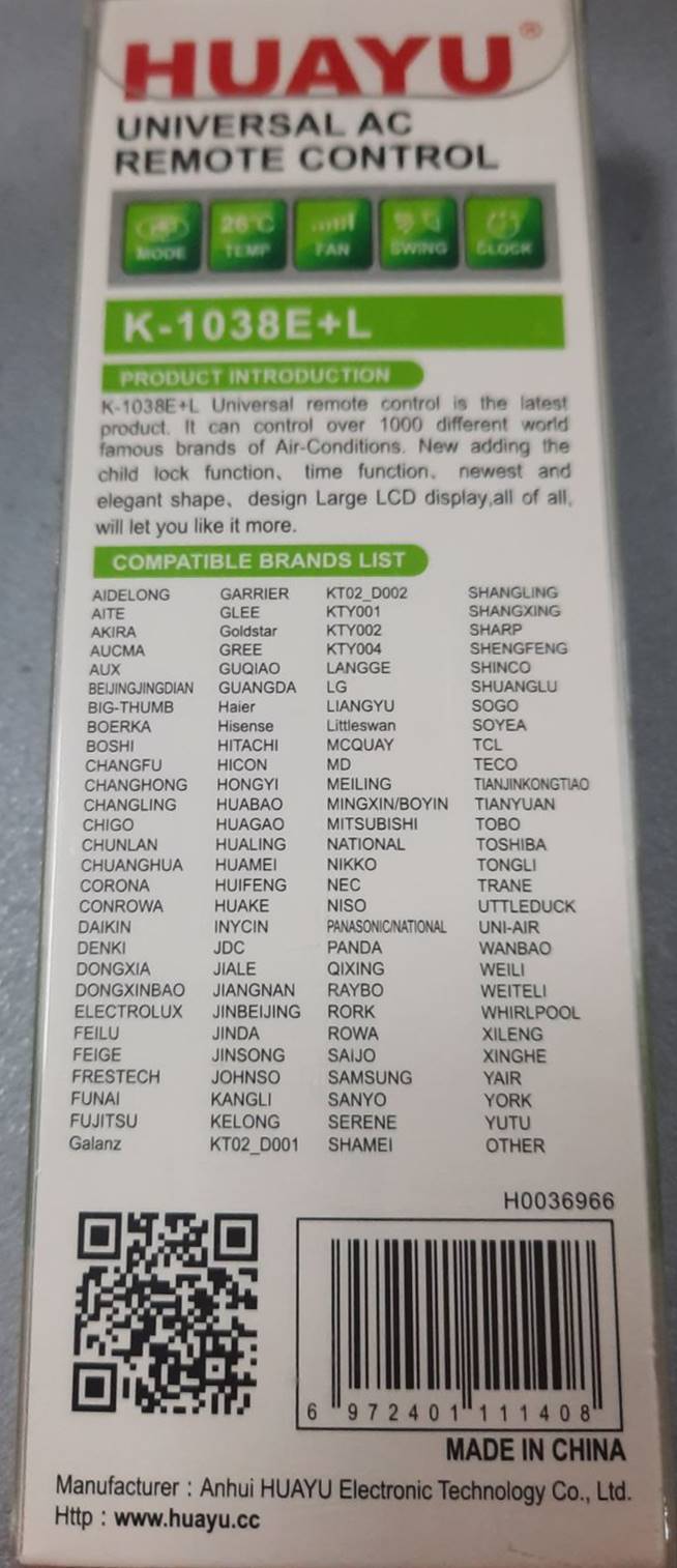 Универзален Далечински Управувач за Клима K-1038E+L